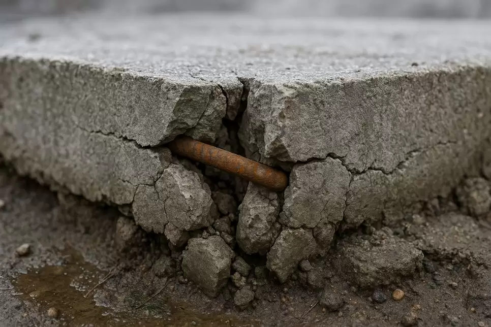 Уменьшение толщины фундамента напрямую снижает его жёсткость и способность распределять нагрузку на грунт. Но не менее опасно уменьшение так называемого «защитного слоя» — расстояния от поверхности бетона до арматурного стержня. Если этот слой меньше нормы (обычно 40-50 мм), сталь становится уязвимой для влаги и кислорода. Запускается процесс электрохимической коррозии: арматура ржавеет, а образующаяся окалина занимает в 2-3 раза больший объем, чем исходный металл. Возникающее внутреннее давление буквально разрывает бетон изнутри, что проявляется на поверхности в виде характерных вздутий и продольных трещин.