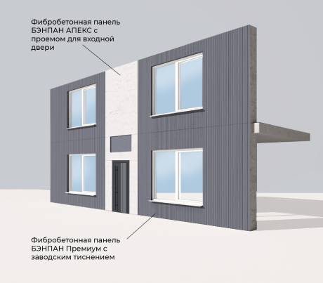 В доме БЭНПАН+ устанавливается вентилируемый фасад, поэтому для отделки можно использовать материалы, применяемые для вентфасадов: керамогранит и алюкобонд, фиброцементные, композитные и терракотовые панели, дерево и камень.