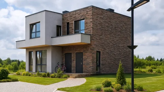 Проект БП-202 - двухэтажный дом 8 на 15, площадью 202 м2, с террасой и балконом, из современных железобетонных панелей БЭНПАН. Загородный коттедж получил двускатную крышу и лаконичный дизайн с интересной проработкой фасада "под кирпич".